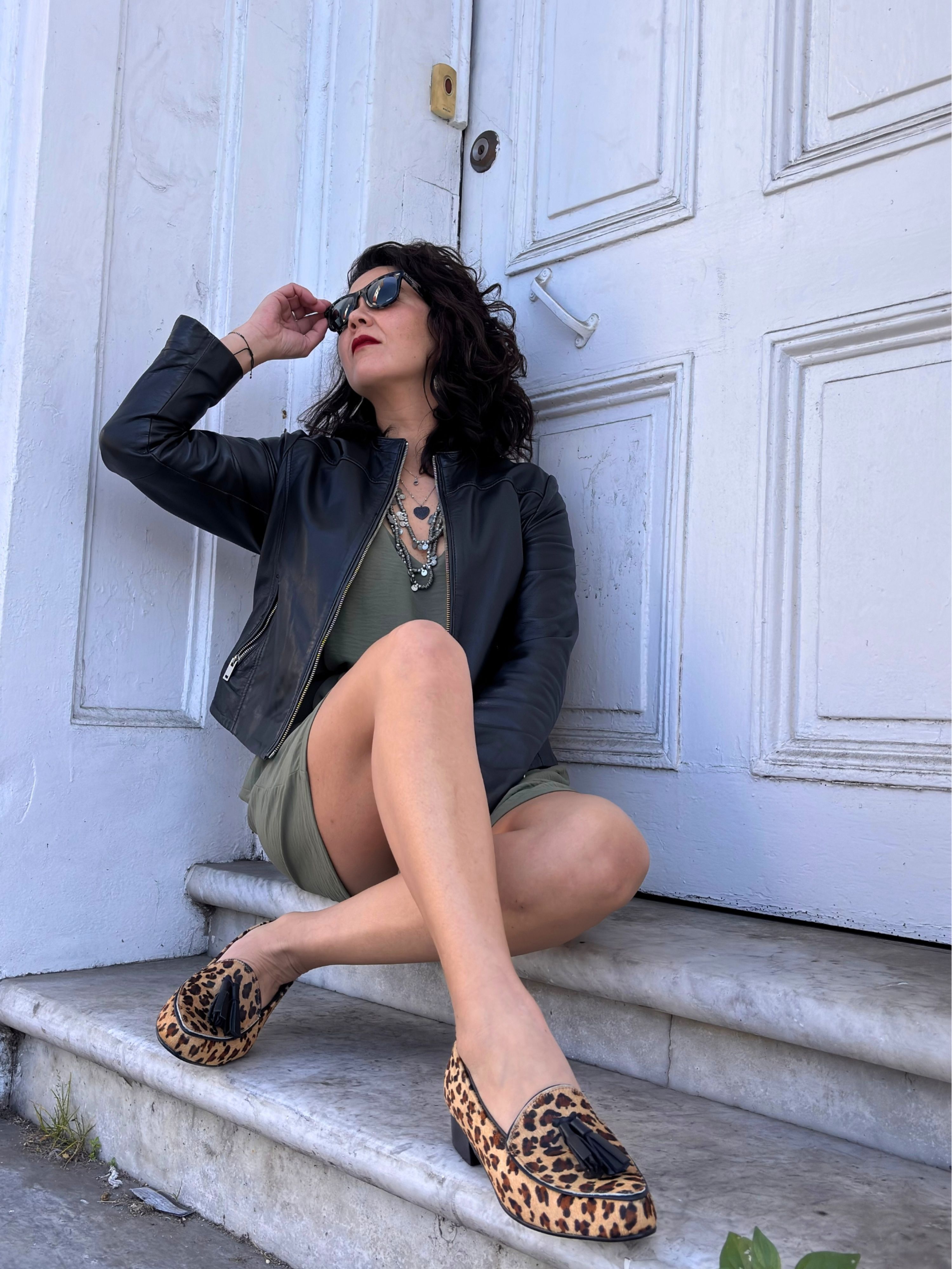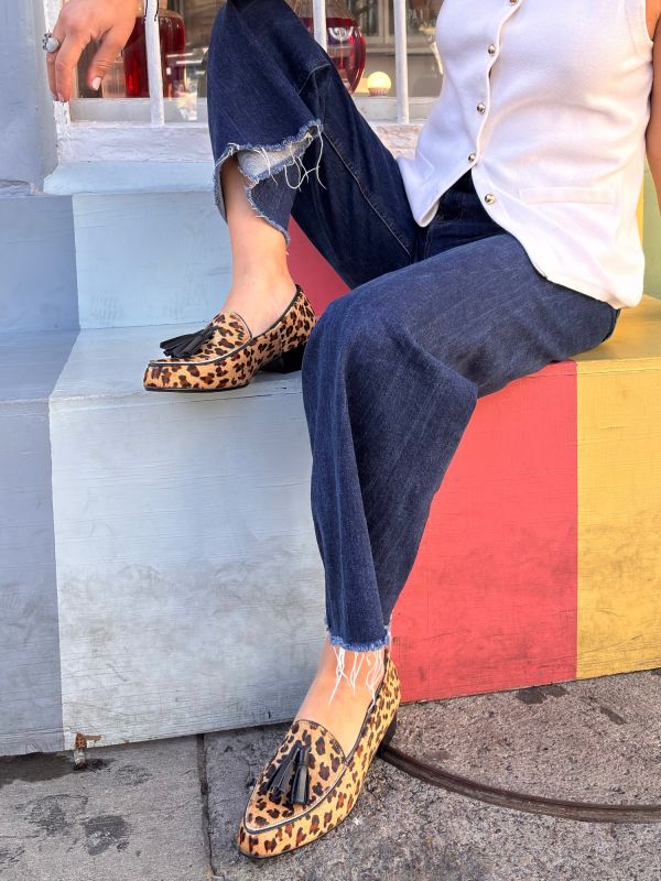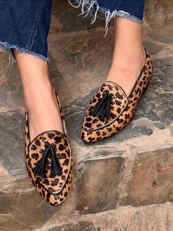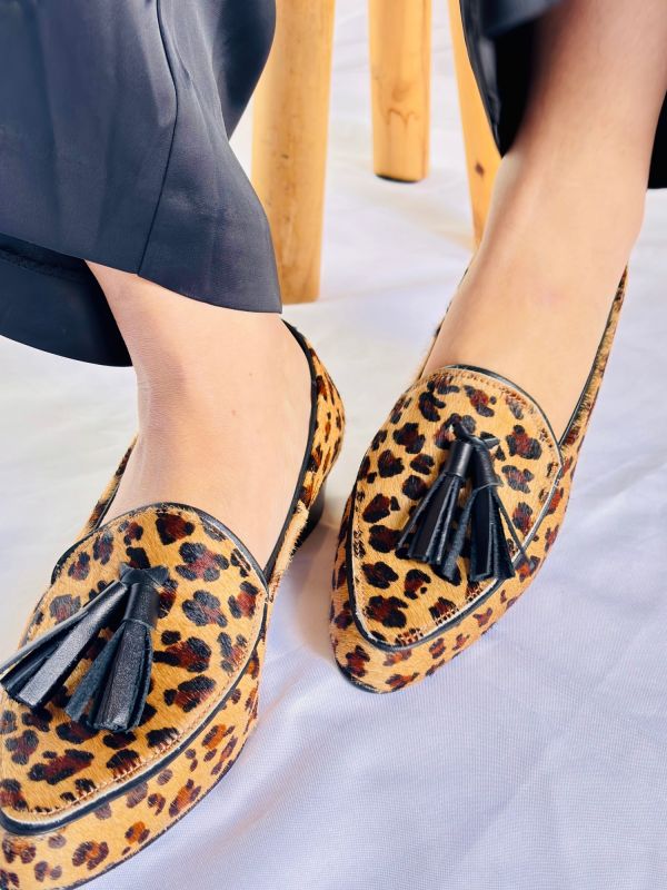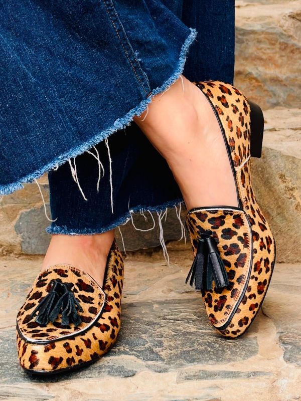 Mocasín Mónaco print, un diseño lleno de estilo y personalidad. El estampado animal print convierte este mocasín en una pieza protagonista, mientras que las borlas de cuero aportan un detalle clásico y sofisticado, con un vivo en el contorno que realza las distintas piezas.